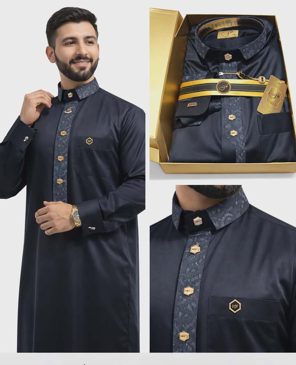 قميص رجالي أنيق من علامة نور الخليل مصنوع من قماش فاخر عالي الجودة يمنح مظهراً راقياً ومريحاً. يتميز بتطريز أنيق على الياقة والواجهة الأمامية مع أزرار معدنية فاخرة تضيف لمسة فخامة. يأتي القميص داخل علبة هدية أنيقة، مما يجعله اختياراً مثالياً لارتدائه في عيد الفطر وعيد الأضحى أو لتقديمه كهدية مميزة في العيد.